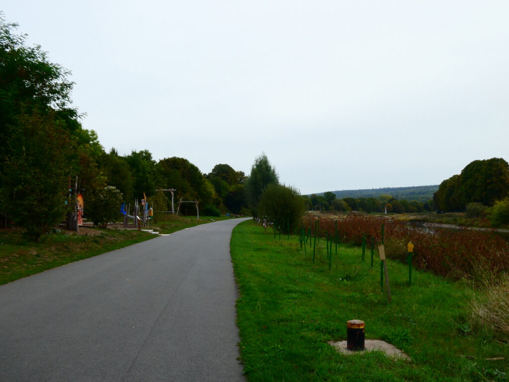Direkt hinter dem Kloster Corvey biegt der Weg rechts ab und wir kommen wir zur Weser. Zehn Kilometer geht es den Fluß entlang. Ohne Besonderheiten. Entspannend. Fast schon meditativ. In jedem Fall eine gute Möglichkeit, sich für den Tag „warm zu fahren“. Auch der Fluß fließt gemächlich gen Norden.