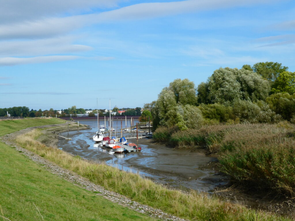 Über die Stephanibrücke kommen wir nach Bremen-Neustadt und biegen dann am Hohentorsplatz rechts ab. Es geht durch ein Gewerbegebiet, dann am Hafen entlang. Nach knapp 10 Kilometern lassen wir die Stadt hinter uns. Es geht am Naturschutzgebiet Hochwasserschutzpolder vorbei und dann sind wir wieder an der Weser. Beim Hafen Hassebüren verlassen wir kurz den Deich, kehren am Ochtumsperrwerk wieder zum Fluss zurück.