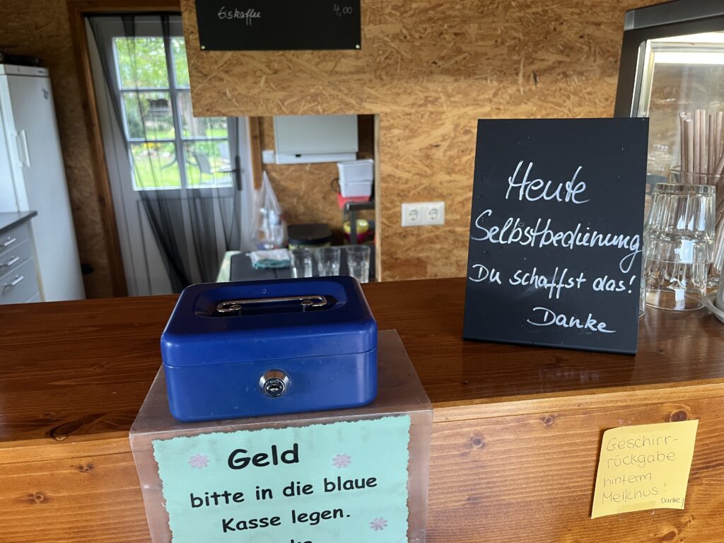 An einem Melkhus kurz vor Elsfleth machen wir Pause. Diese „Milchhäuser“ gibt es oft an den Radwegen in Norddeutschland. „Unser“ Melkhus ist nur am Wochenende bewirtschaftet, heute ist Selbstbedienung.