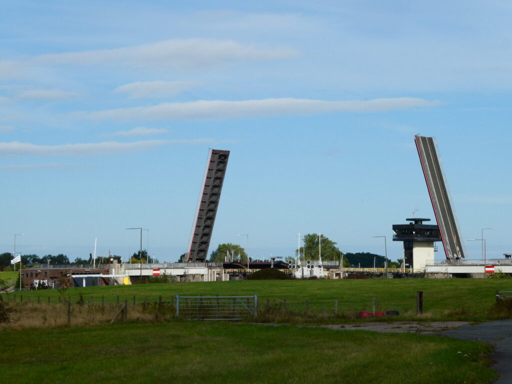 Wenige Kilometer nach dem Melkhus kommt die nächste Pause, diesmal ist es eine „Zwangspause“. Das Hunte-Sperrwerk ist nur zu jeder vollen Stunde passierbar und so müssen wir warten. Schon von weitem sehen wir, dass wir warten müssen.